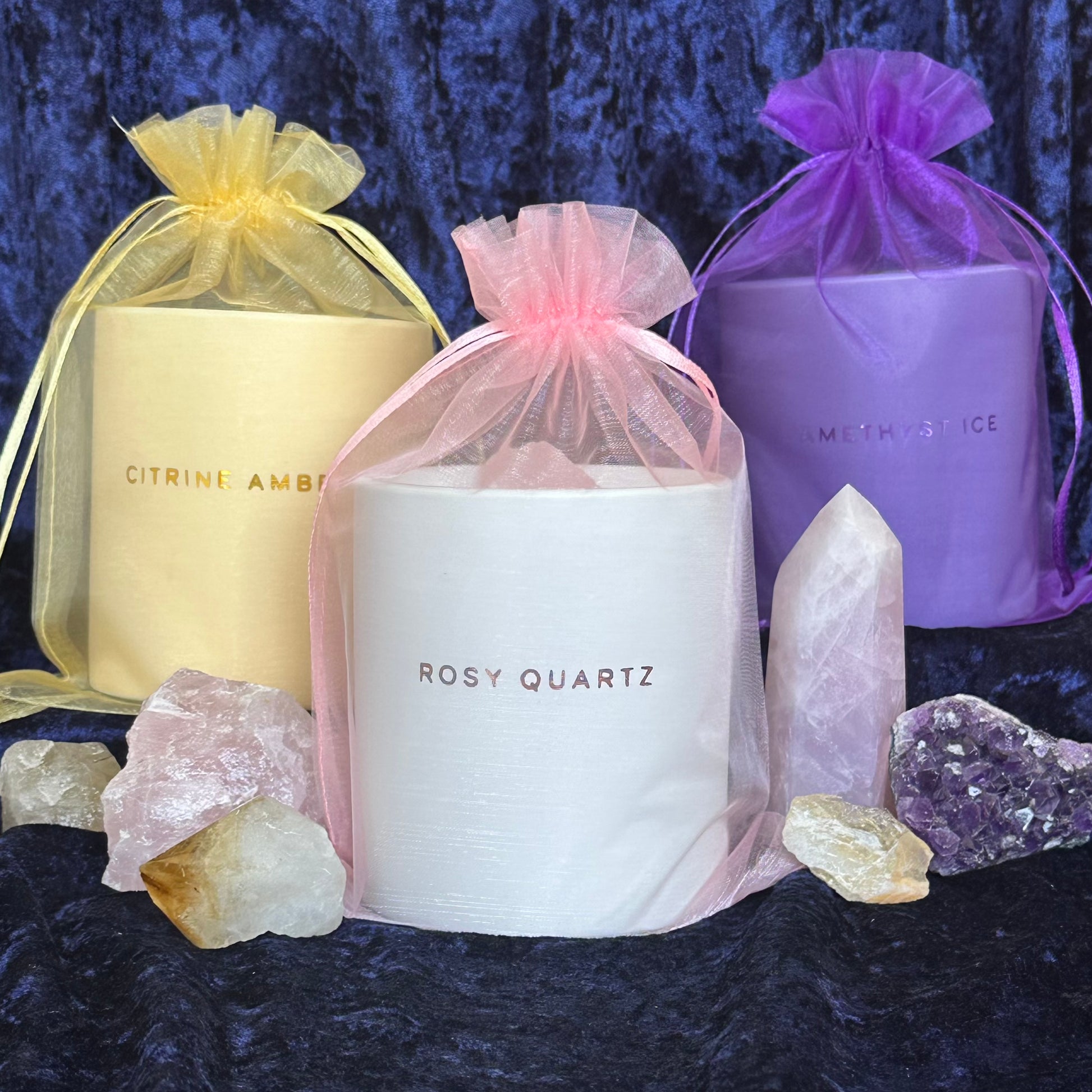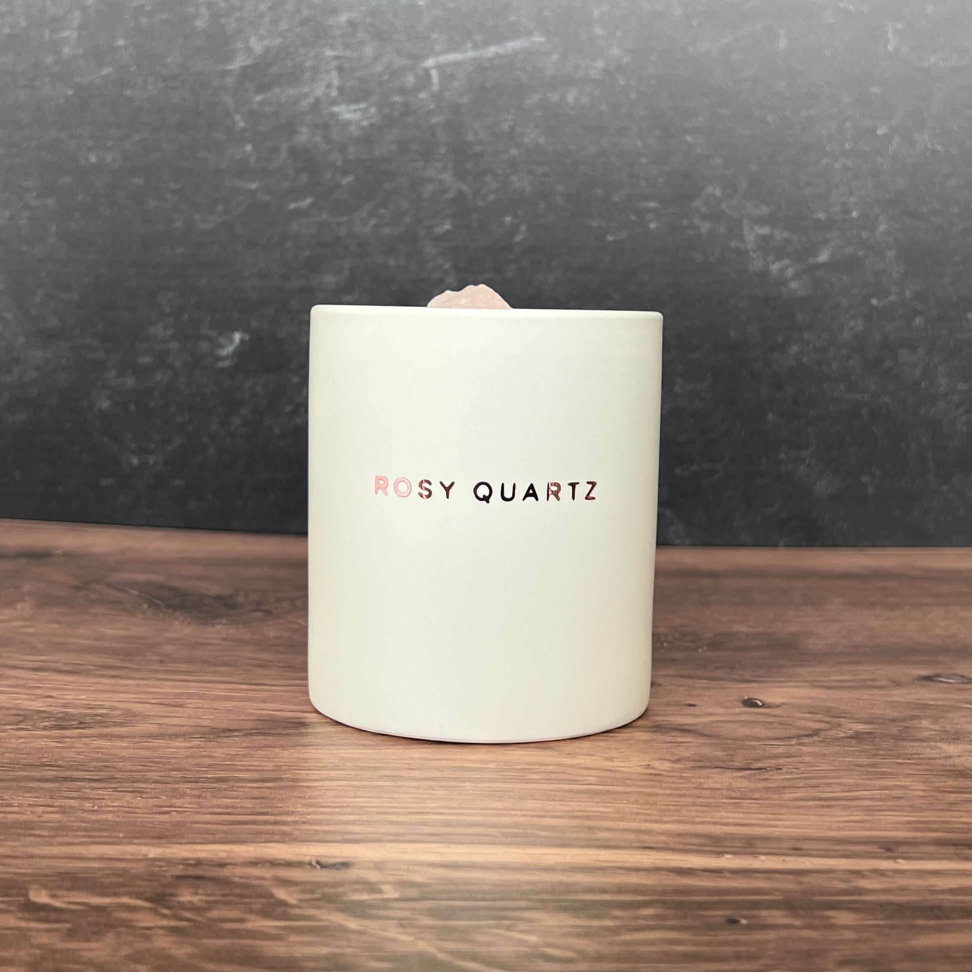 This candle has notes of pear, rose, and cucumber with a rose quartz crystal on top.